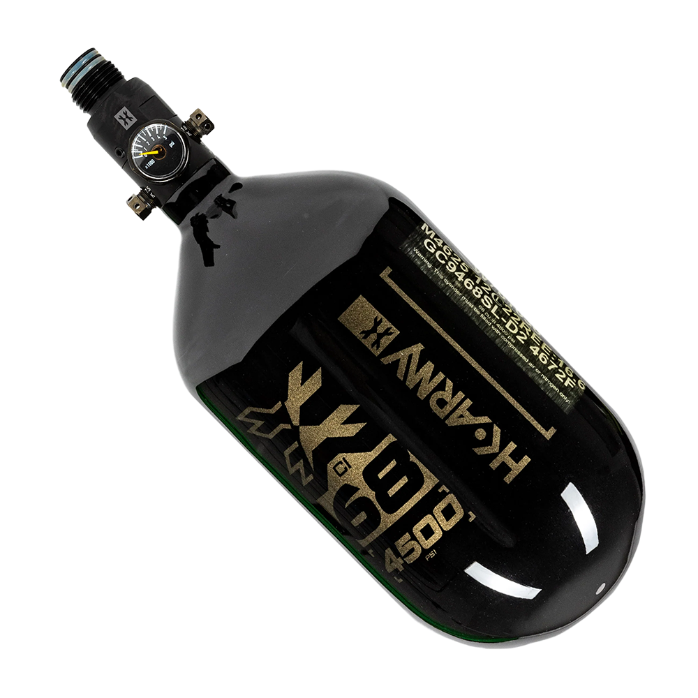 Previous Image Next Image HK Army Aerolite Extra Lite Carbon Fiber Compressed Air Paintball Tank With Standard Regulator – 68/4500 – RUSH – Black/Gold